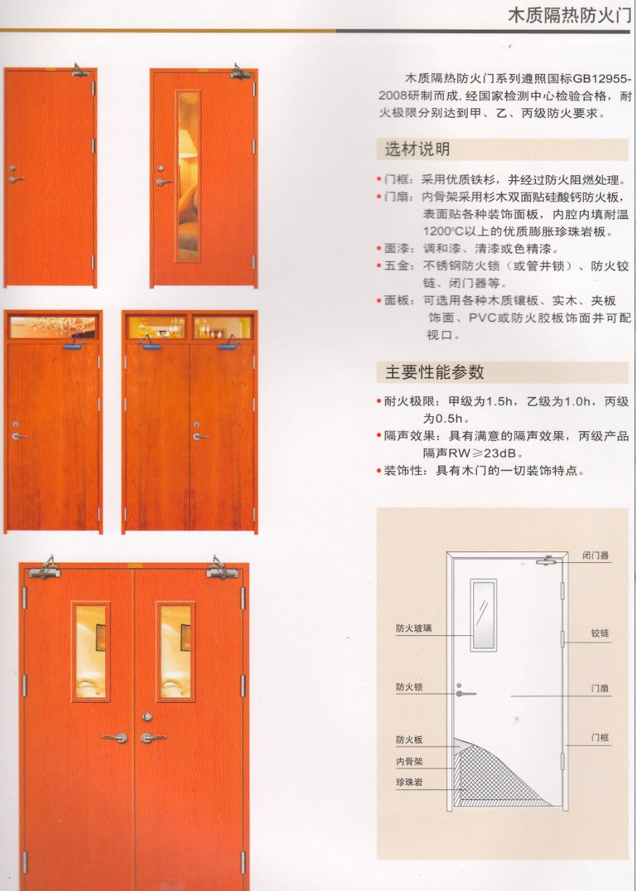 門扇:內(nèi)骨架采用雜木雙面貼或硅酸鈣防火板,表面貼各處裝飾面板,門腔內(nèi)填耐高溫的優(yōu)質(zhì)珍珠巖防巖棉。